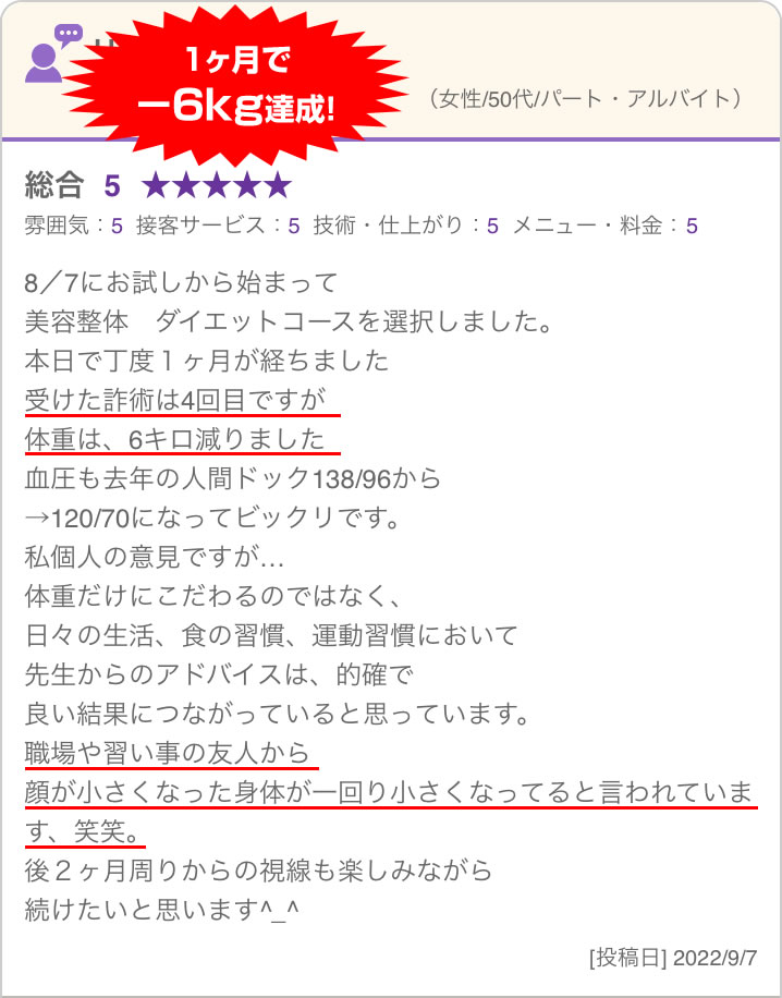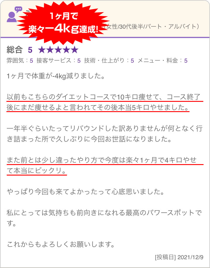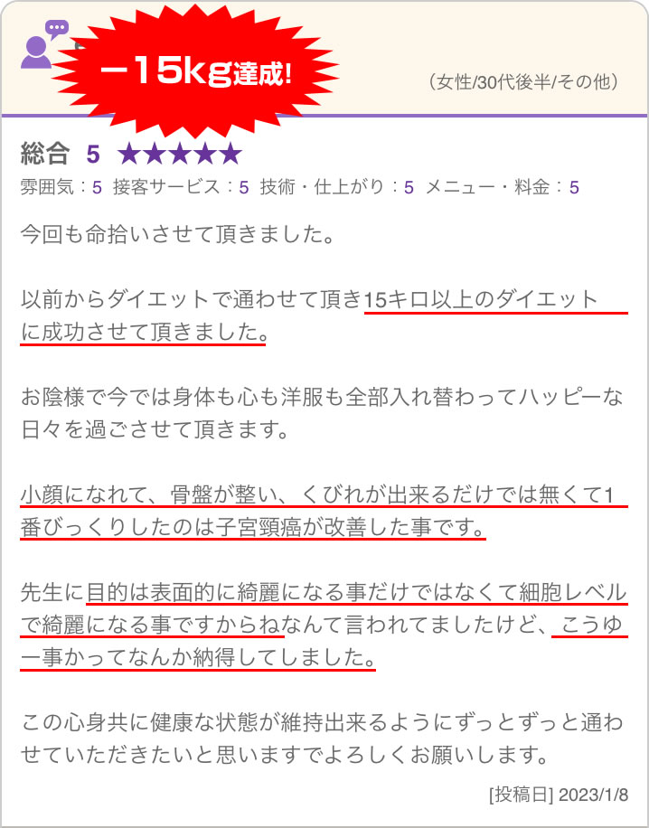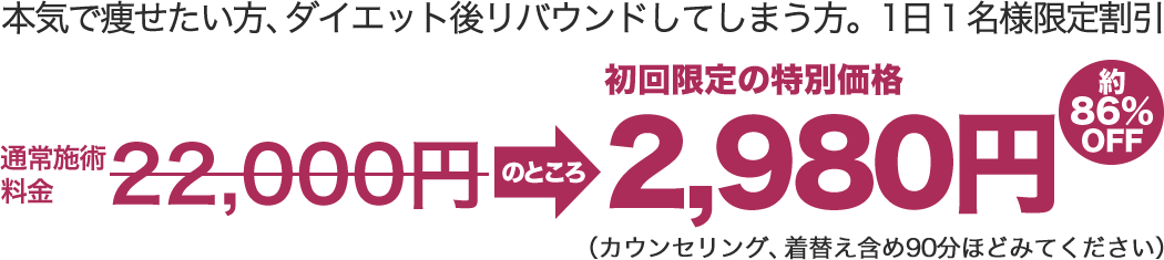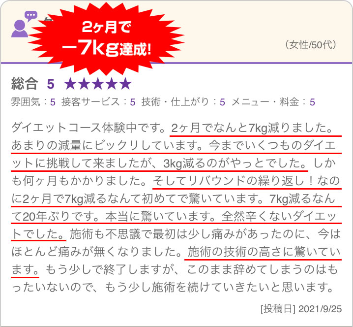 いまひとつ効果を感じられないサロンで、なんとなく「安いし、近いから」といった理由でお金と時間を無駄に使い、いつまでたっても「リバウンド・自己流」が改善されない選択