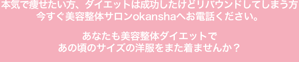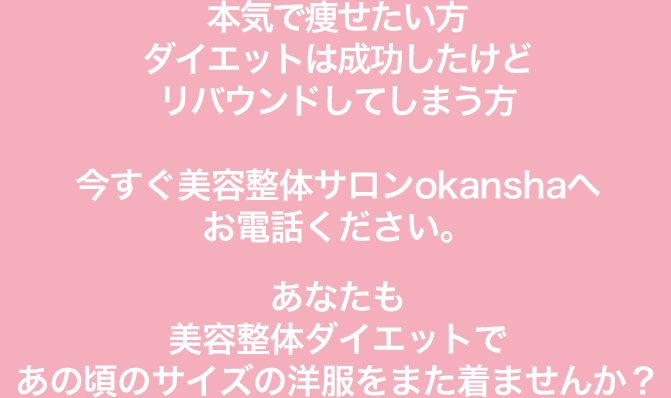 もし何度もリバウンドでお悩みでしたら今すぐ美容整体サロンokanshaにご相談ください。