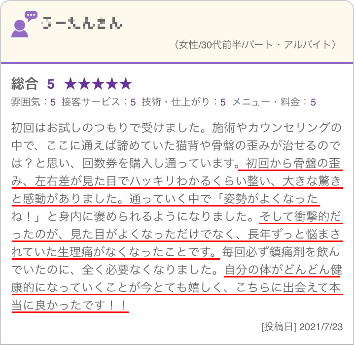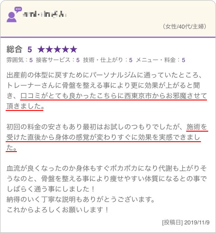 まずは姿勢がすごい良くなったと言うのと、お腹が1回目にやってもらった後に家に帰って鏡を見た時点で真っ直ぐになってる、お腹がへこんでる感じで、わぁ〜凄いなと思ったのと、恥骨の痛みが無くなったんですよね。それでもうここに通おうと思いました。