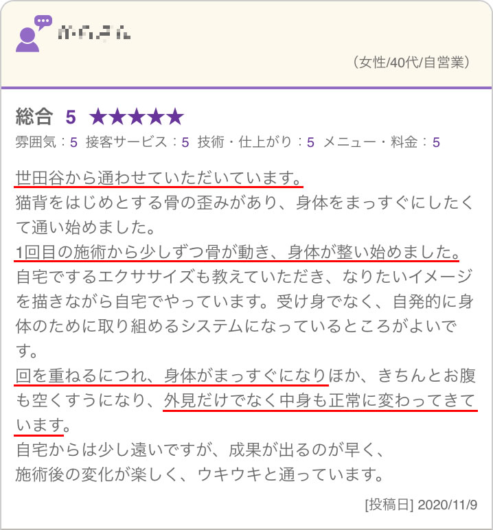 痛みはほとんどありませんし、むしろ本当に心地いい施術なので、そこが本当に他と違ってバキバキすることもなく本当に気持ちいいなと思いながら通わせて頂いています。
