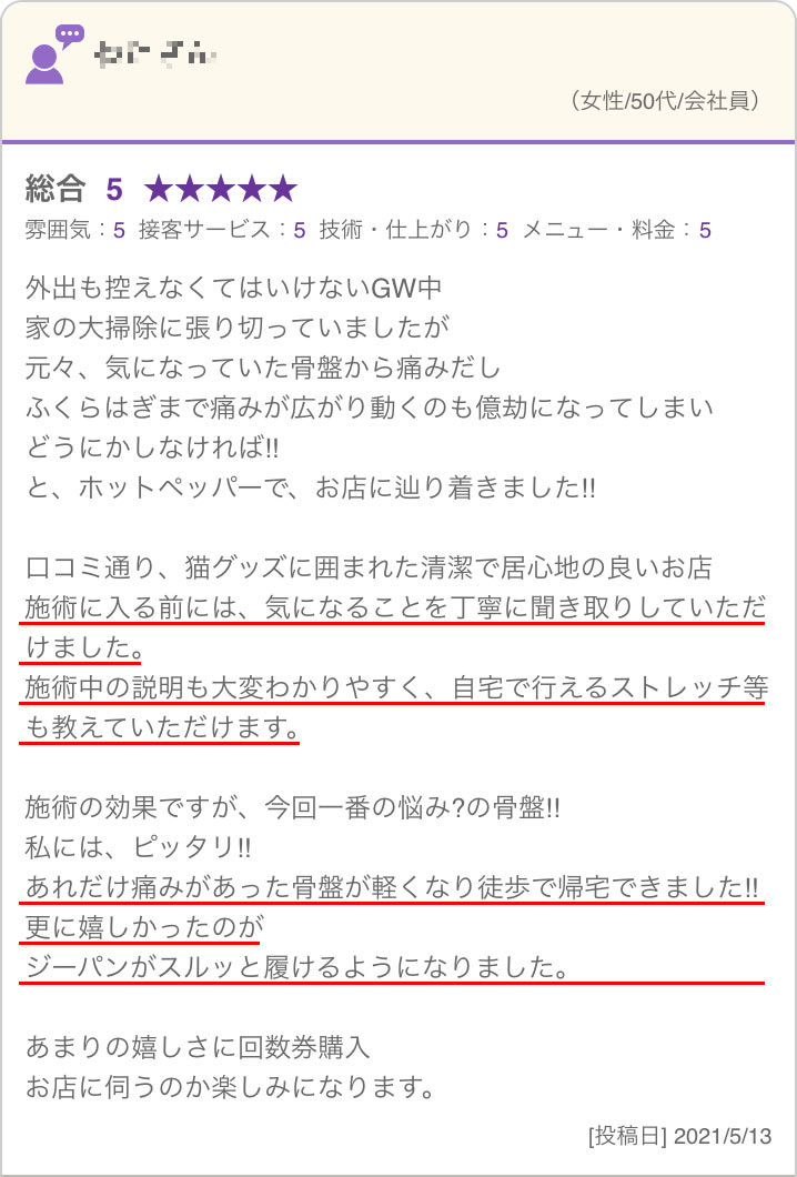 痛みが取れるのはもちろん、産後太りも改善ができるんじゃないかとホームページで来てみようかなと思いました。家が近かった事もあり、痩せる事ができるというお店構えを見ていたのでここに来ようと思いました。